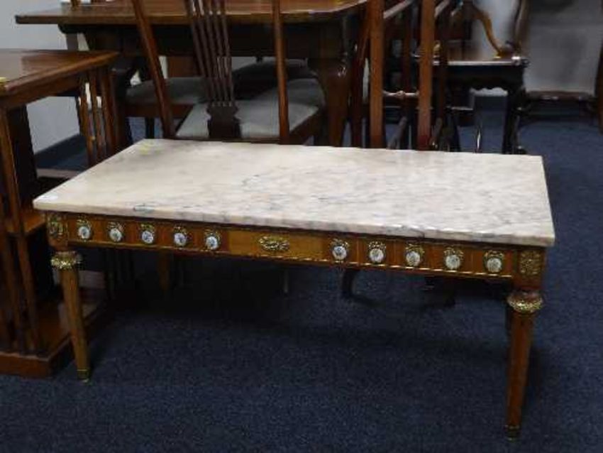 An inlaid mahogany marble topped coffee table with ormolu mounts