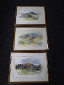 Three framed watercolour and pen and ink drawings depicting rural mountain landscapes