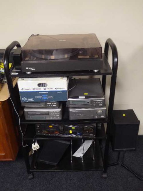 A contemporary trolley containing trio turn table, Denon four piece separate system, Technics tape deck and a pair of Wharfedale Diamond IV speakers and a box of CDs