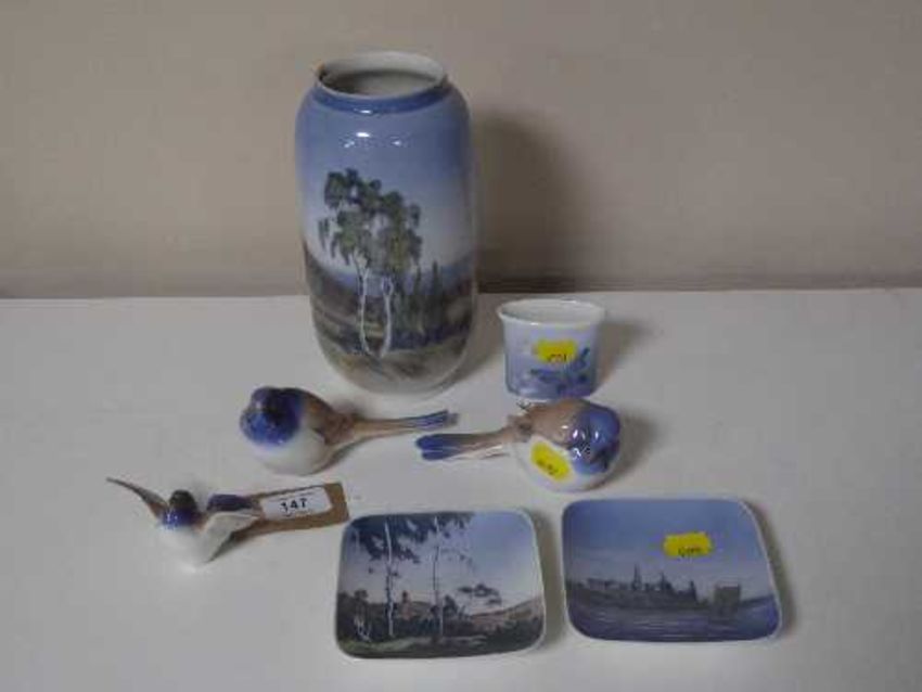Three Bing and Grondahl bird ornaments together with two Royal Copenhagen dishes and two vases, similar