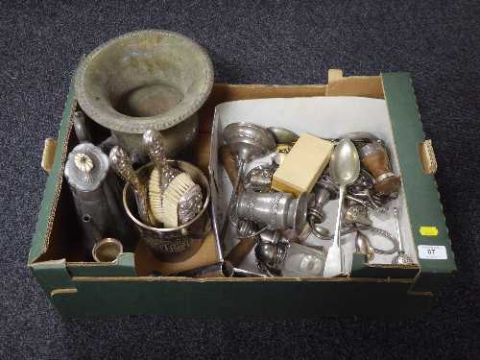A box containing a quantity of plated ware including three piece brush set, twin handled planter, coffee pot, cutlery etc
