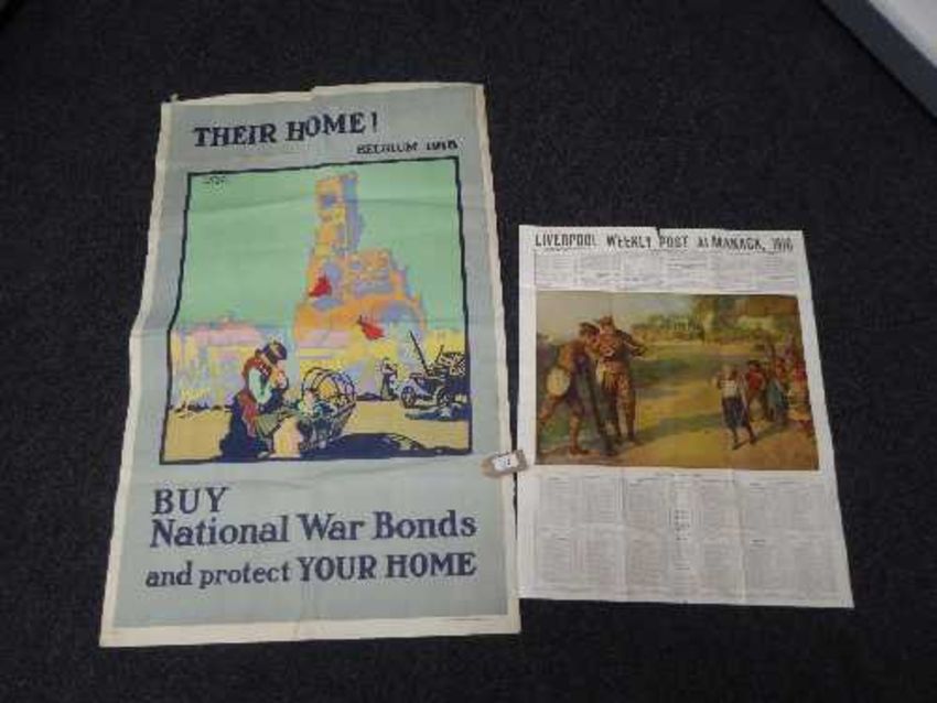 A WWI They're home Belgium 1918 By National War Bounds and Protect Your Home Poster, by F. Gregory Brown with a Liverpool Weekly Post Almanac game