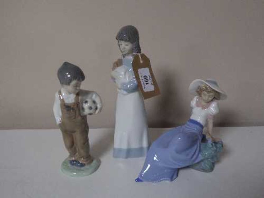 Three Nao figurines, girl with puppy, girl seated with bird and boy with football