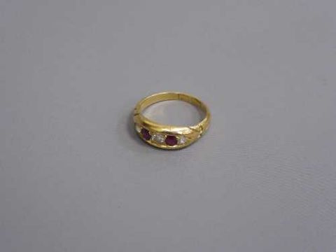 An early twentieth century 18ct gold three stone diamond and ruby ring, 4.4g, ring size M.