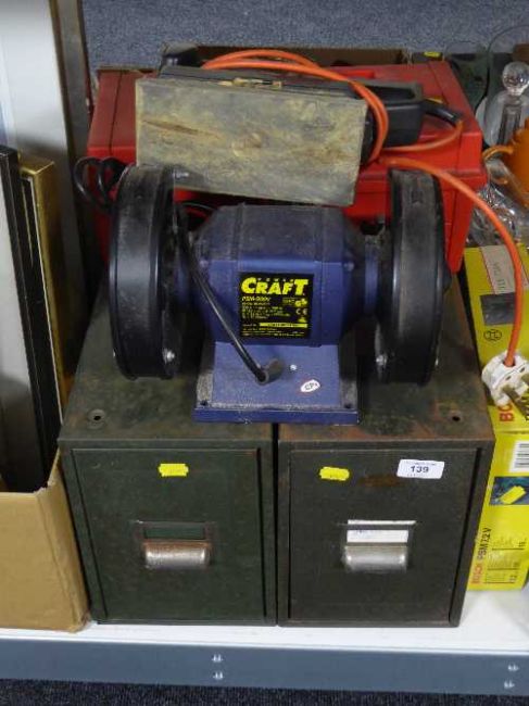 Two metal index drawers together with a toolbox and tools, Bosch sander and cordless drill, Powercraft bench grinder