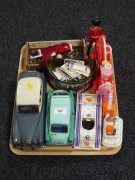 A tray containing a box of marbles, mid-20th century Japanese tin plate car and a Japanese tin plate Rolls Royce Silver Cloud, cigarette cards etc