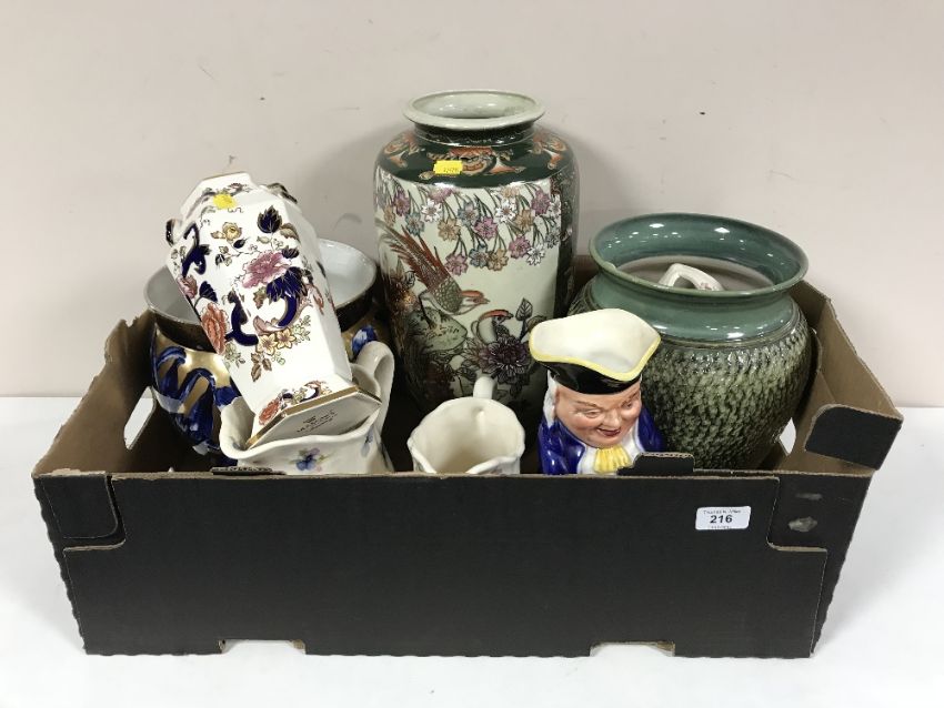 A box of pottery vase, three graduated jugs, Masons Mandalay vase, Poole vase, Burlington ware toby jug et