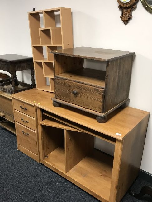 A pine effect computer desk and matching filing chest, pine bedside stand and beech wall shelf