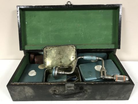 A wooden joiner's box and a vintage case of paint brushes, brace, pliers, wood cutting tools etc