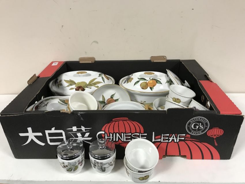 A box of Royal Worcester Evesham oven dishes, ramekins, Port Merion flan dish