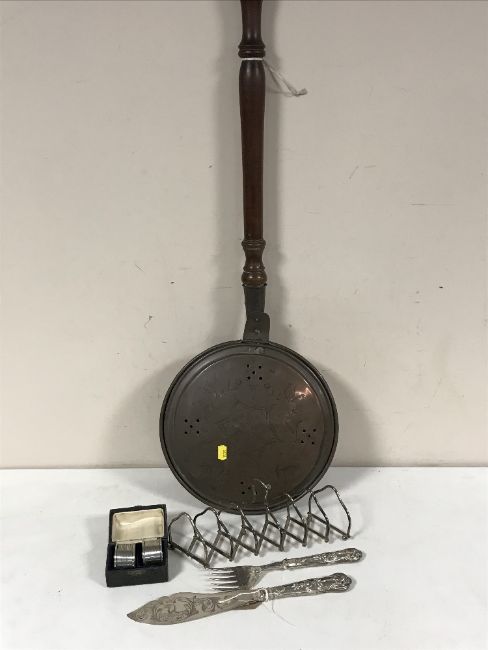 A pair of silver napkin rings together with pair of plated servers, expanding toast rack and a copper bed warming pan.