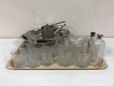 A tray of plated baskets, boxed Swarovski swan, glass ware, paperweight etc