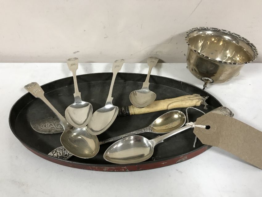 Five silver teaspoons and one other, silver knife and a scrap silver sugar basin