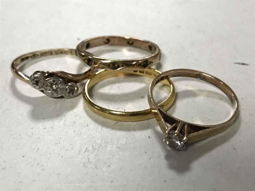 Four rings - 9ct gold with diamond solitaire, 22ct gold band, 9ct gold and platinum diamond ring and a 9ct gold band ring.