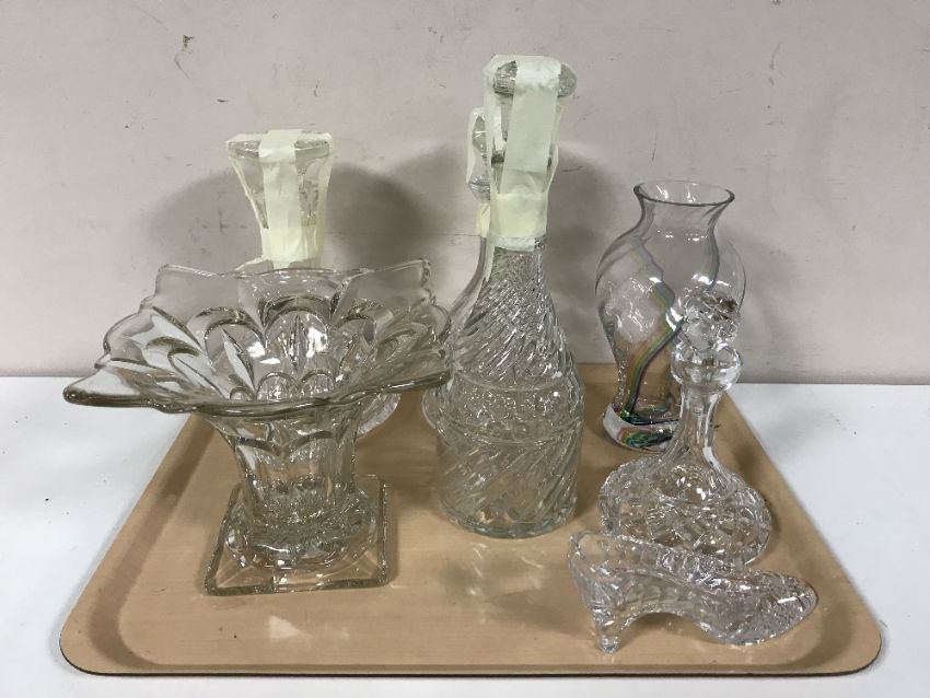 A tray of crystal glassware including decanters, vases