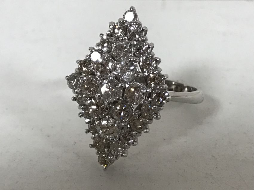 A diamond cluster ring, set with 29 brilliant-cut diamonds in a marquise setting, size P