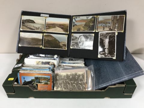 A box of assorted post cards and two post card albums