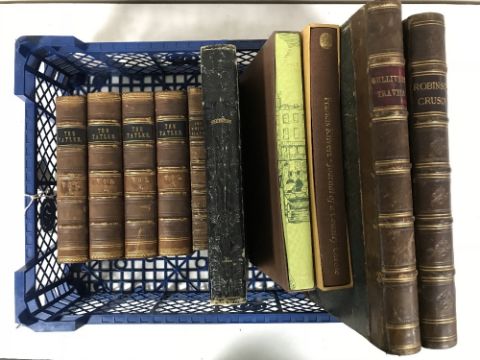 Four leather bound volumes : The Tatler, two leather bound volumes : Gullivers Travels and Robinson Crusoe, one volume : The White Slave, an antiquarian poetry book and two Folio Society books