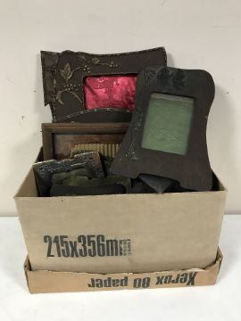 A box of assorted early 20th century oak and copper picture frames