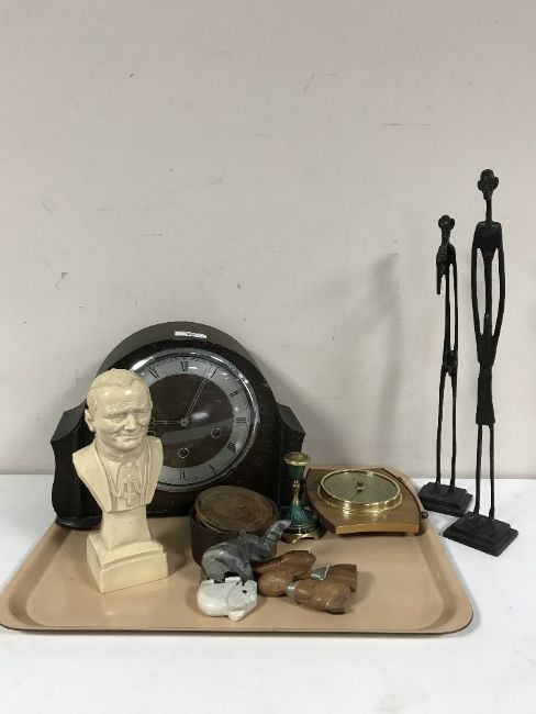 Walnut barometer, oak mantel clock, bust of John Paul II, metal figures etc