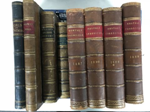 A basket of nine leather bound volumes including four volumes : The Monthly Chronicle of North Country Lore & Legend dated 1880's and 1890's, five further volumes : World of Wonder, Scott Wortheys, Rollands Ancient History etc
