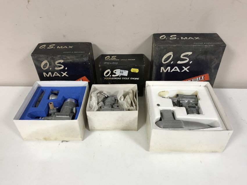 Three boxed O.S. model air craft engines - FS-40, 4 / cycle engine, 61 VF, 61 FSR