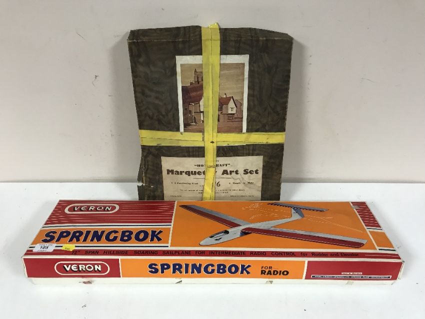 A boxed Veron Springbok 72 inch soaring sail plane and a boxed Marquetry art set