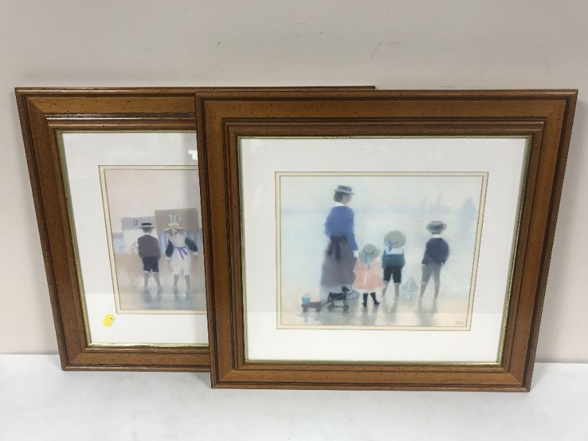 A gilt framed mirror and a pair of framed prints - figures on a beach
