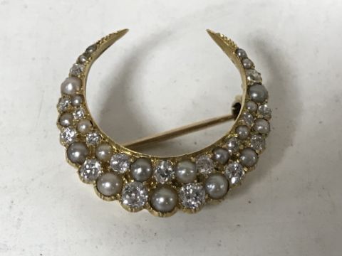 A Victorian old cut diamond and pearl crescent shaped brooch, 7.4g, width 26mm.
