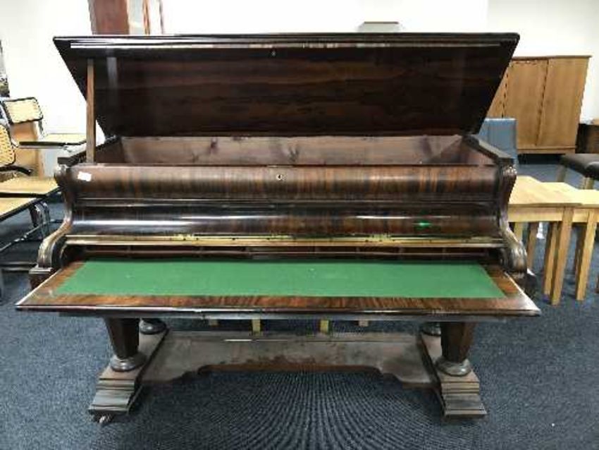 A rosewood baby grand piano converted into a writing desk