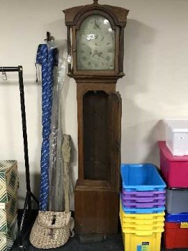 A 19th century oak long cased clock with painted dial (pendulum and weight)