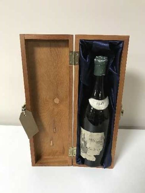 A bottle of 1947 Gevrey wine in wooden box, label damaged