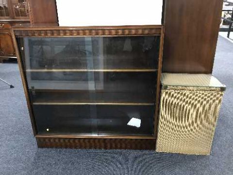 A mahogany sliding glass door bookcase together with a loom glass topped linen box