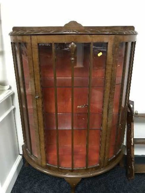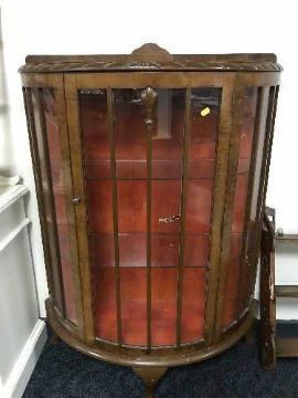 A walnut d-shaped display cabinet and a carved wall shelf