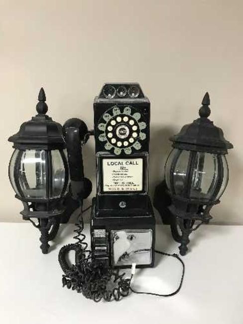 A retro style telephone, two out door carriage lamps and an 16 " LG TV with lead and remote