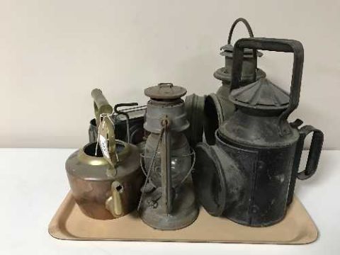 A tray of three railway lamps, an oil lamp, Radius brass stove, brass and copper kettle (no lid)