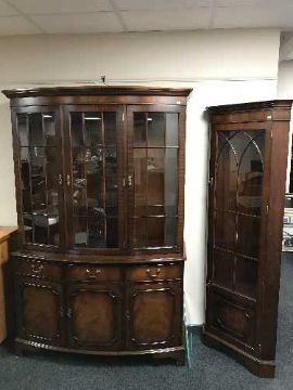 A mahogany Bradley triple door display cabinet fitted cupboards beneath together with matching corner cabinet