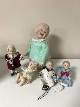 A porcelain headed Ashton Drake doll - Yolande, six other miniature porcelain headed dolls