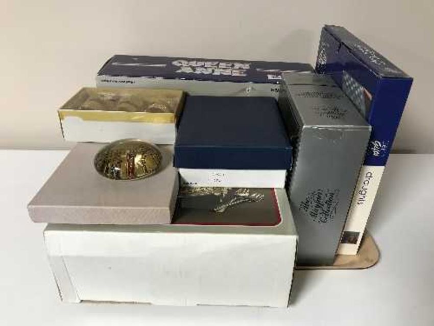 A tray of boxed plated ware inc. entree dish, The Mayfair Collection candelabra, napkin rings, H Samuel hors d'oeuvre dish on stand, cake servers and a late 19th century Jeipel Steam Trap paperweight