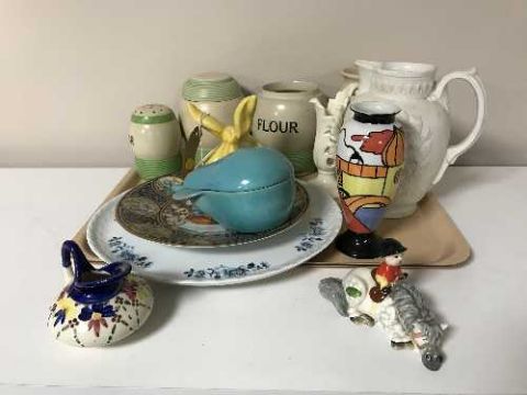 A tray of John Beswick figure - boy on pony, pottery kitchen storage jars, Clarice Cliff style vase etc