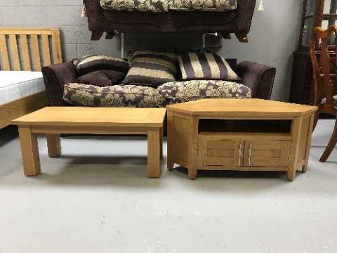 An oak corner TV stand and matching coffee table