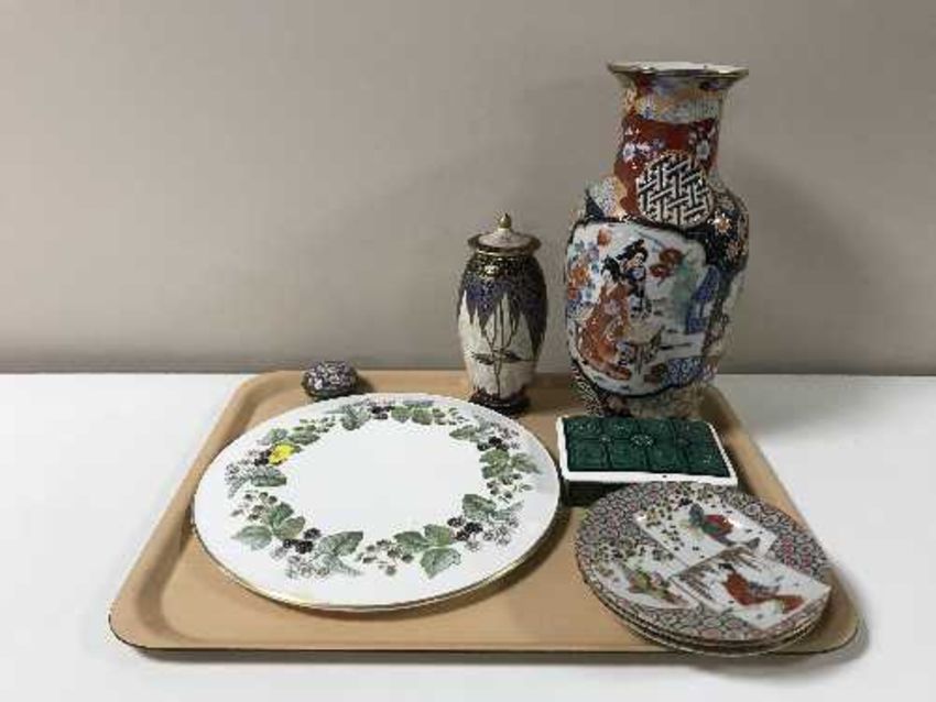 A tray of brass dressing table mirror, oriental tea plates, Wedgwood bone china lidded pot, Carlton ware gilded vase, cloisonne lidded dish etc