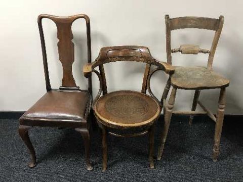 A mahogany framed dining chair, Bentwood armchair and an antique pine high stool