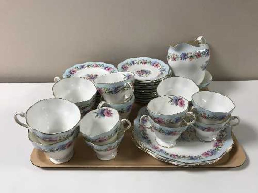 A tray of forty three piece Foley bone china cornflower pattern tea service