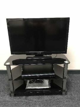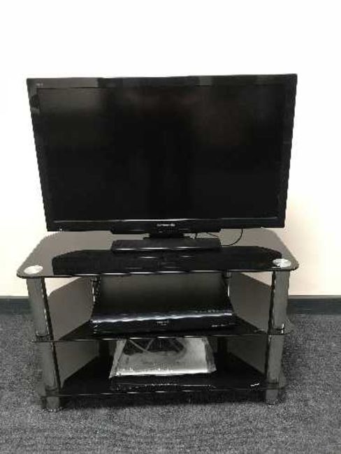 A Panasonic 32" LCD TV with remote on stand, together with a Panasonic DVD player