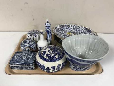 A tray of blue and white china in an oriental style including plates, jelly mould, trinket box etc, Wedgwood Jasper ware, delft plate etc