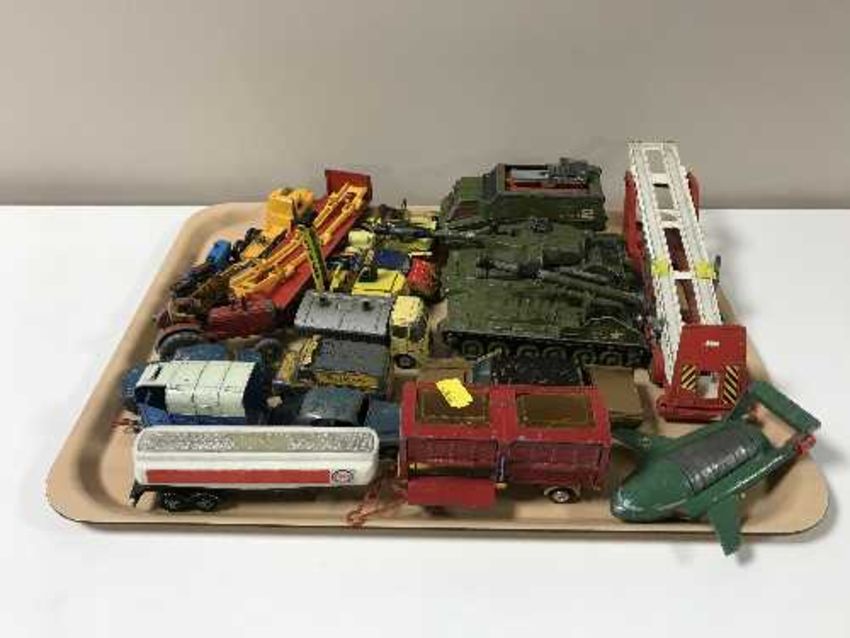 Two trays containing a large quantity of play-worn Dinky and Corgi die cast vehicles
