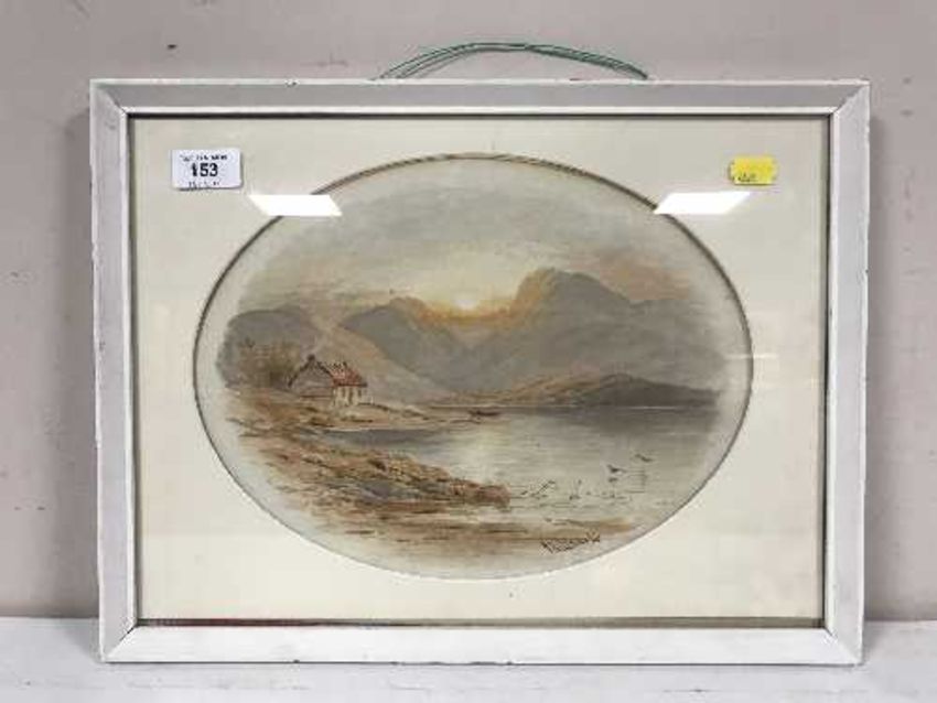 A framed J. Liddell watercolour depicting a house by a lake