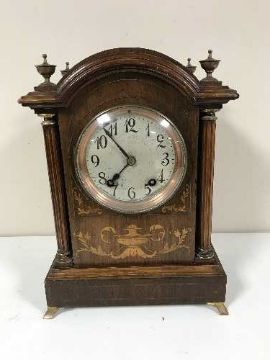An Edwardian inlaid mahogany quarter-striking eight-day bracket clock, the movement inscribed "Lenzkirch 1 Million" and numbered "405372", complete with key, pendulum and inlaid mahogany wall bracket, clock height 37 cm.
