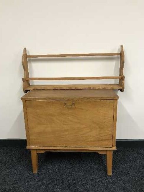 A teak record cabinet and a pine wall shelf